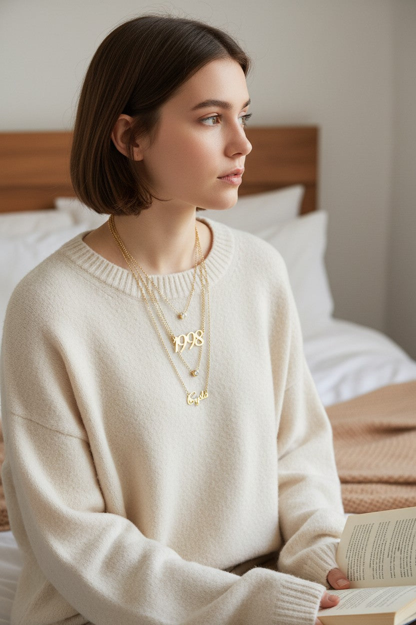 Custom Layered Name & Birth Year Necklace with Birthstone – Personalised Gold Pendant Set (90s/Y2K Inspired Jewelry)