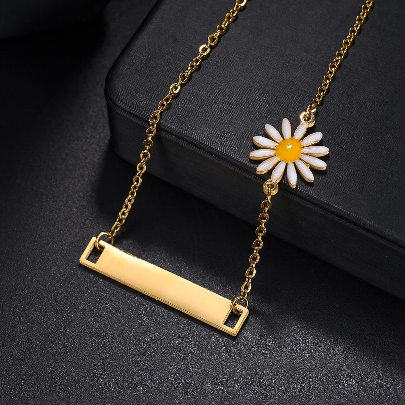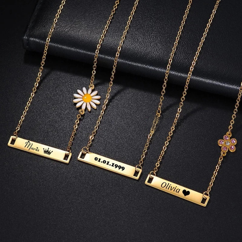 Create a piece that’s truly yours with our Custom Engraved Bar Necklace, beautifully finished in gold and paired with your choice of charming pendant from cute daisies to sparkling birthstone flowers. Personalise the bar with your name, initials, a special date, or a meaningful word, and choose the charm style that matches your personality.