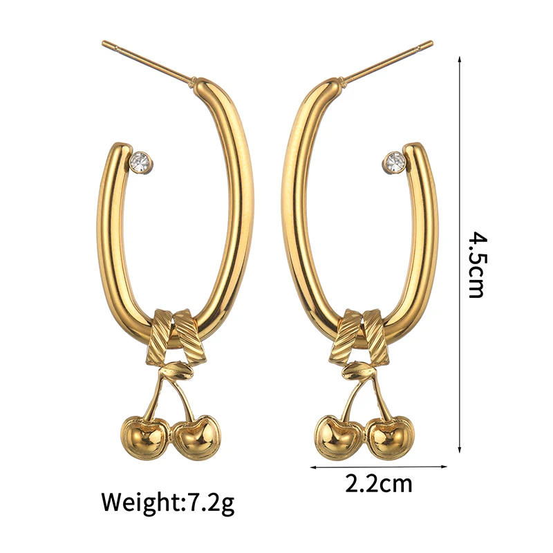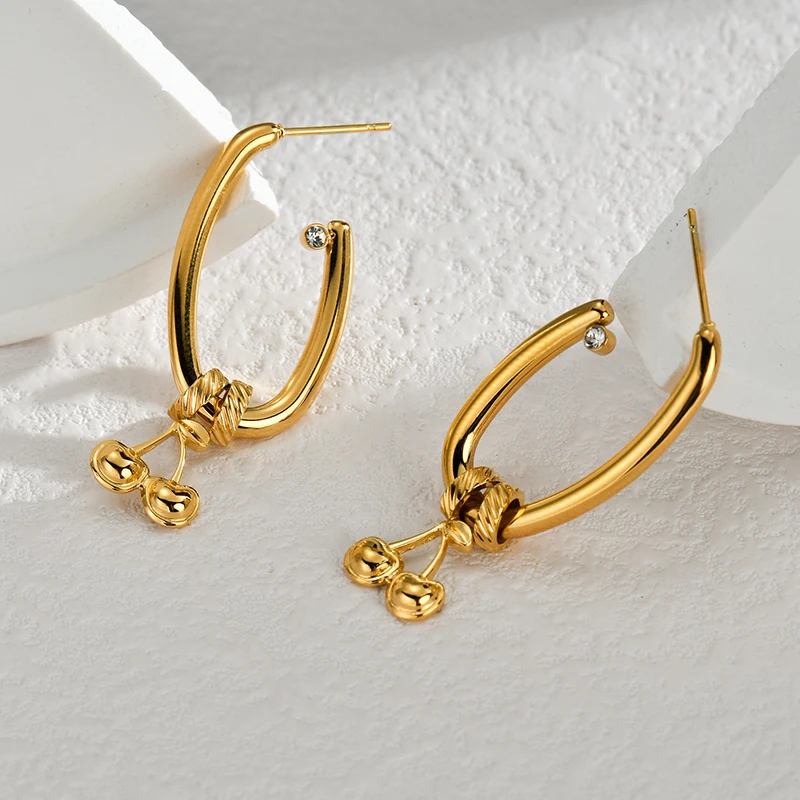 Gold Cherry Hoop Earrings – Luxury Stainless Steel Drop Earrings with Crystal Accent