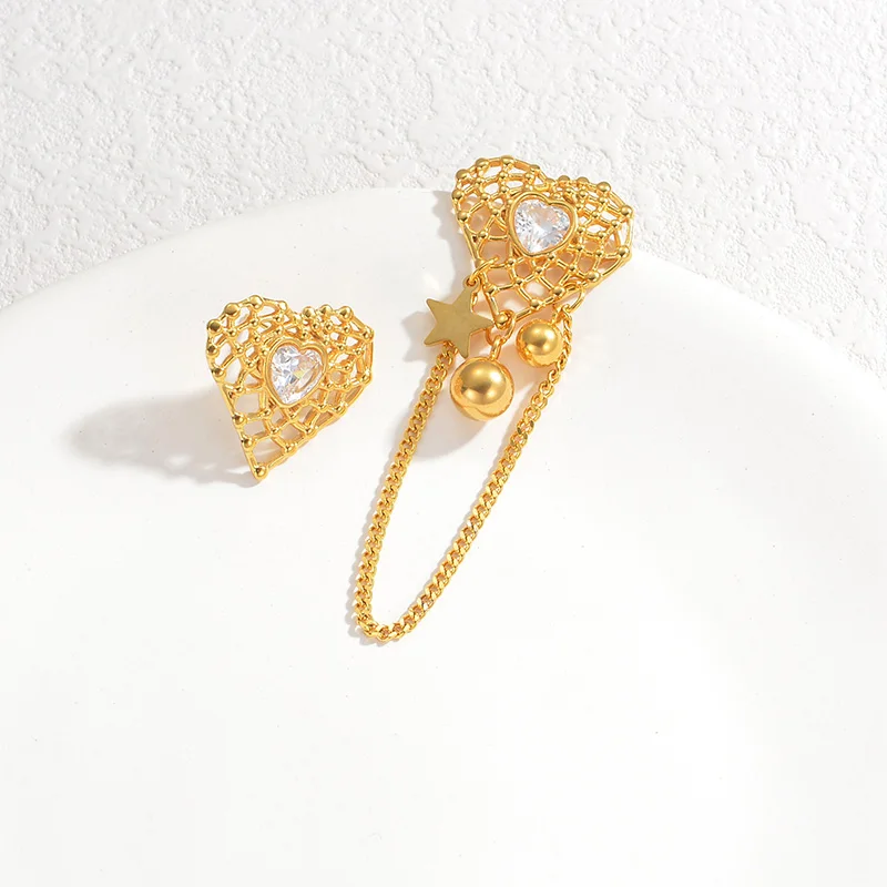 Turn heads with these stunning Gold Heart Mesh Drop Earrings, beautifully crafted for modern women who love to shine. Each earring features an intricate open-mesh heart design with a sparkling crystal centerpiece, complemented by playful dangling chains, star, and bead charms.