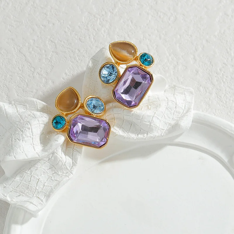 Add a pop of color and elegance to your look with our Luxury Colorful Gemstone Stud Earrings, a stunning blend of artistry and sophistication. These earrings feature a vibrant mix of amethyst purple, aqua blue, and champagne gold stones set in a polished gold-plated base, designed to sparkle from every angle.