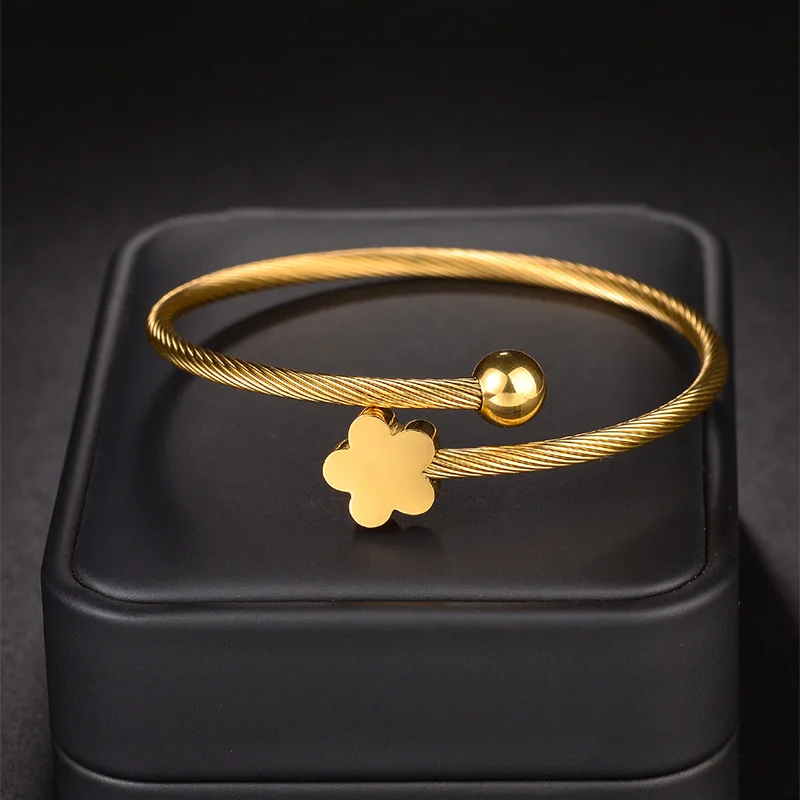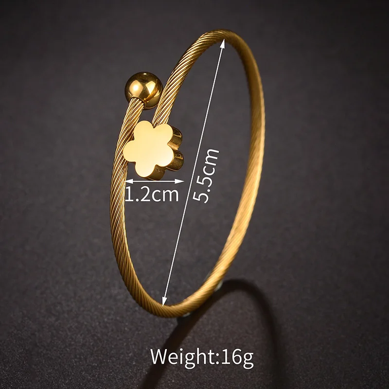 Bring elegance and good fortune to your style with our Luxury Gold Four-Leaf Clover Bangle Bracelet, a timeless piece designed for the modern woman. Crafted from high-quality stainless steel with a radiant 18K gold finish, this bracelet combines sophistication and simplicity in one beautiful design.