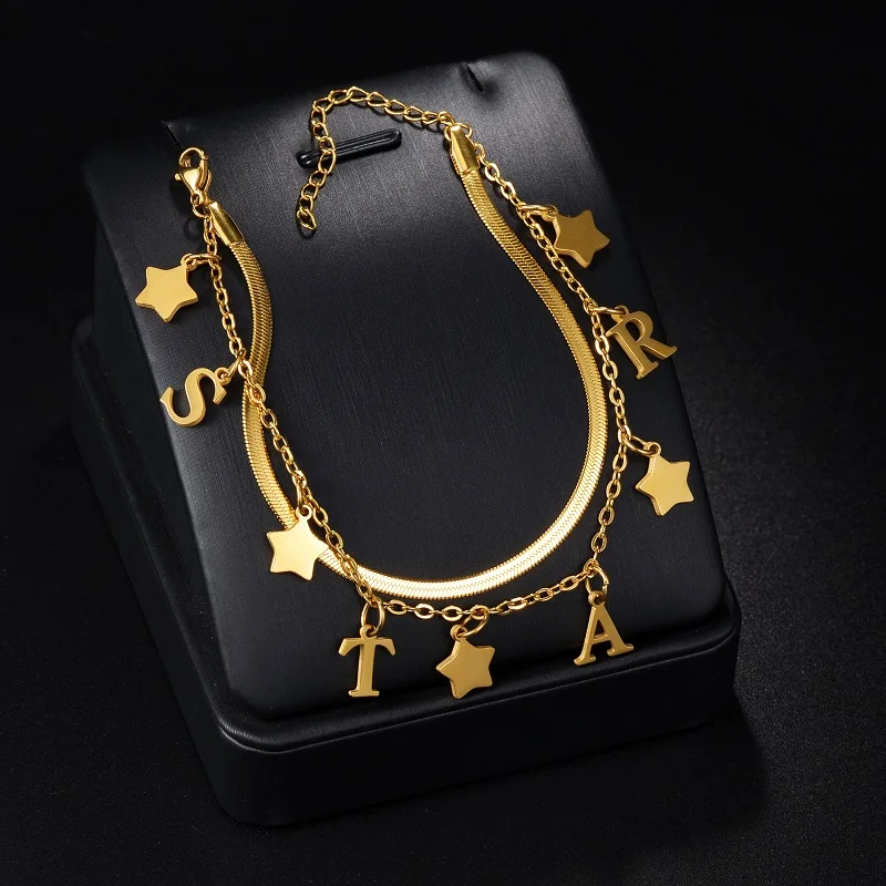 Each anklet in this set combines elegance with individuality, featuring custom name plates or STAR-themed charms crafted from high-quality stainless steel and finished in 18K gold plating.